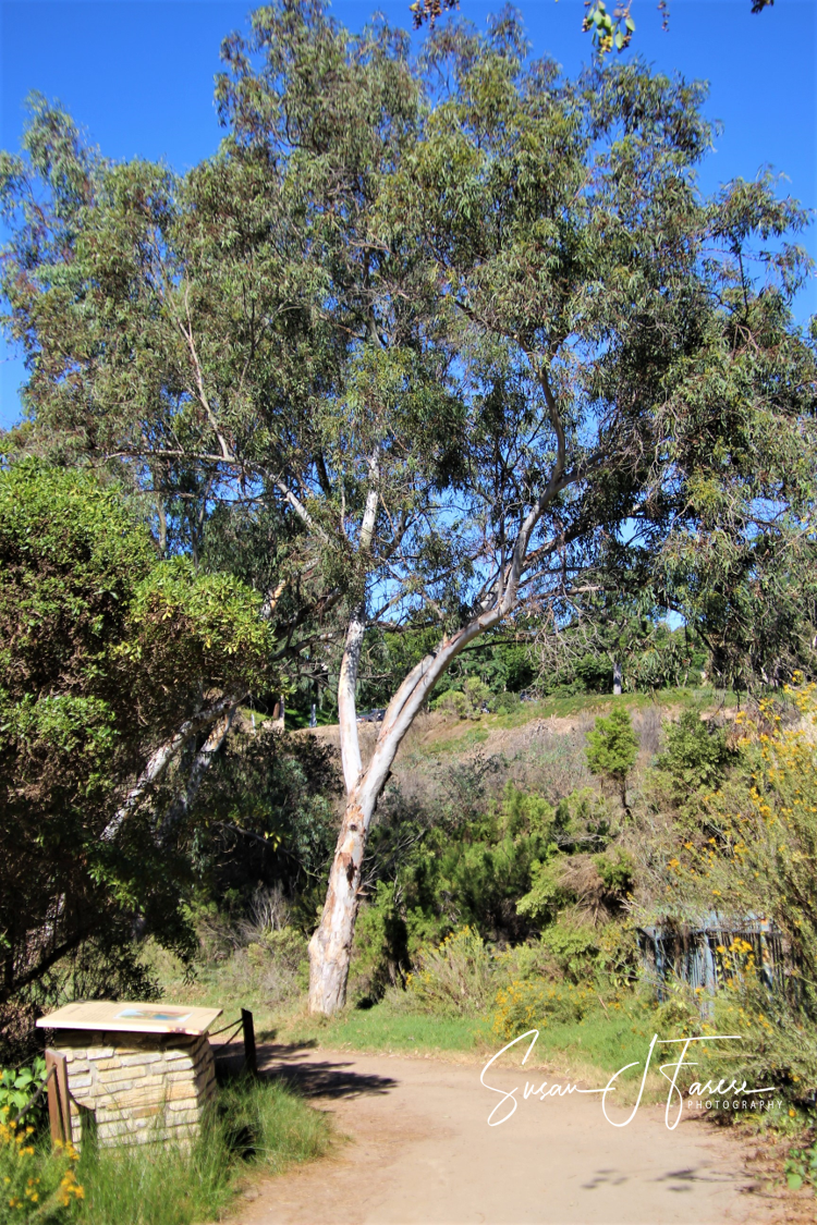 We saw the glistening blue water of the lagoon, a variety of shorebirds and other varieties of birds, beautiful aromatic eucalyptus trees, wildflowers complete with bees, a woodpile of artistic tree rings, several inviting thatched roof benches for resting and viewing the lagoon, a lizard on a rock, and much more. We were inspired with so much beauty surrounding us!
